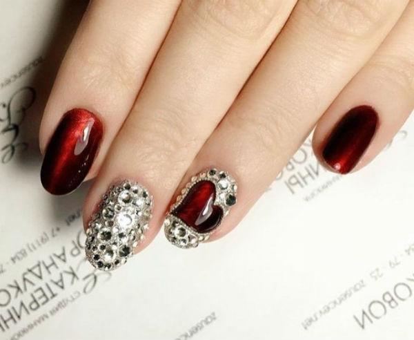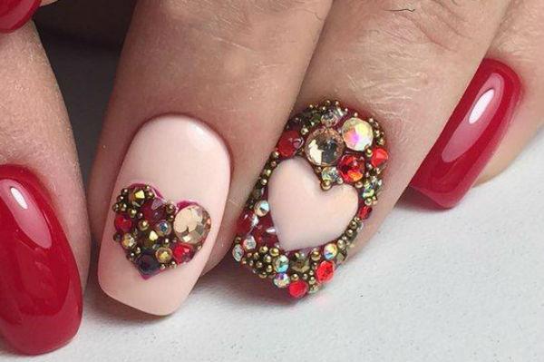 Помимо этого, крупного размера сердца будут красиво смотреться вместе с объемными стразами, камушками или блестками. Это может быть такой маникюр: