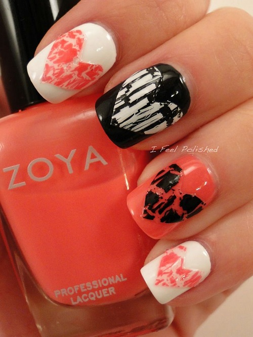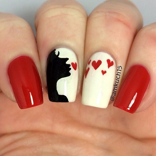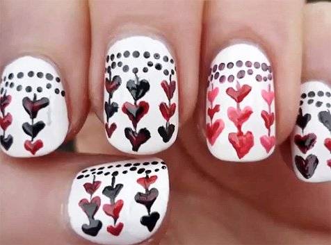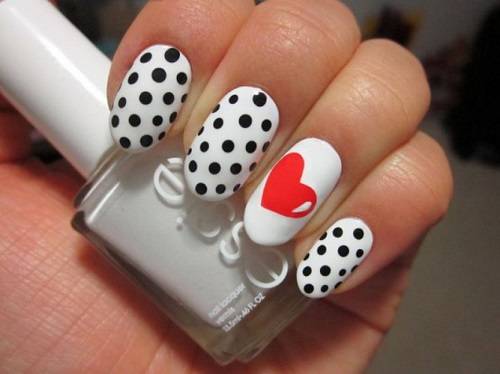Удивительное nail-творение, приуроченное ко дню Святого Валентина. Для создания подобного дизайна понадобиться лак трех базовых цветов: белого, черного и красного.