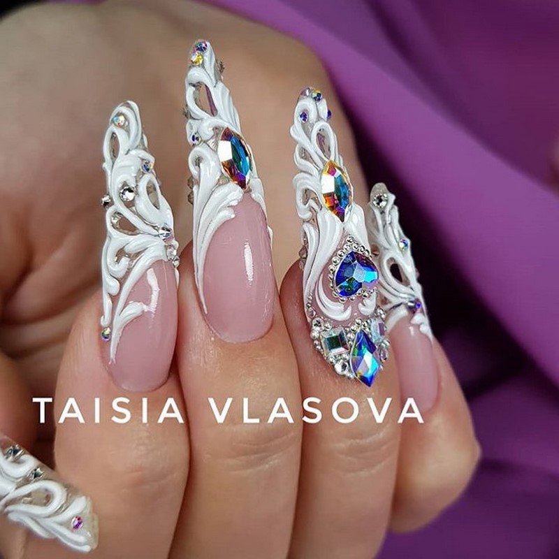 Один из самых простых способов создания шикарного дизайна с сердцами — инкрустация ногтей. Для нее можно использовать готовые крупные стразы в форме сердца, небольшие стразики для выкладывания орнаментов и микробисер для окантовки рисунка. Стразы лучше крепить на густую базу или прозрачную гель-пасту. Если рисунок сложный, вам может потребоваться дополнительная сушка в лампе, чтобы рисунок из страз не «разбежался».
