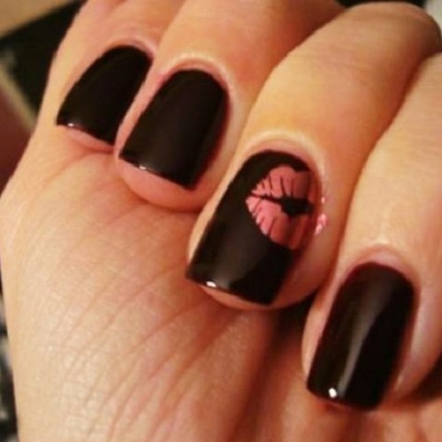 А относительно узоров, хотелось бы добавить, что романтично настроенные особы по достоинству оценят маникюр с поцелуем, также имеющий множество своих вариаций. Ведь это могут быть полные губы, расположенные на каждом пальце или только на каком-то одном, небольшие поцелуйчики в углу ногтя и тому подобные идеи.