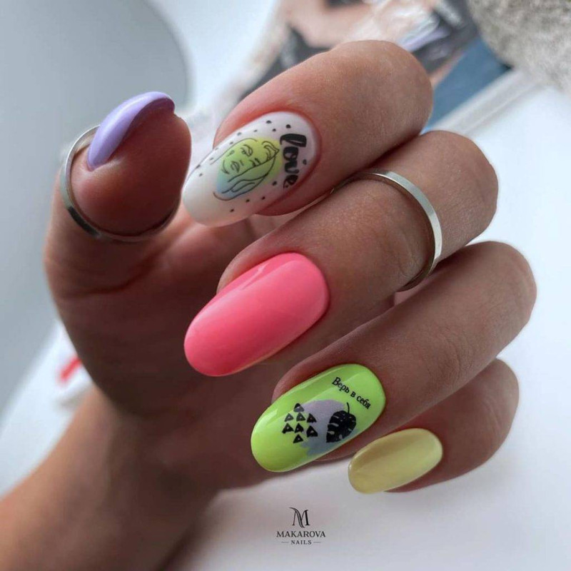 Благодаря крупным, заметным рисункам короткие ногти могут стать визуально изящнее, чем они выглядели бы без декора