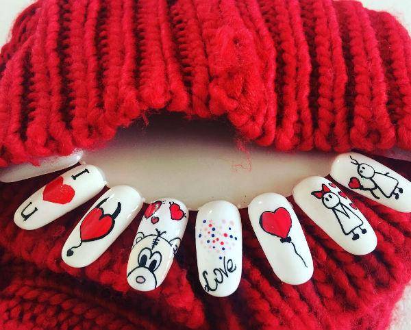 Вот такой вариант маникюра на день Святого Валентина предлагает Ольга Бессонова. Этот дизайн ногтей выполнен по мотивам иллюстраций на вкладышах очень популярной в 90-е годы жевательной резинки Love is.