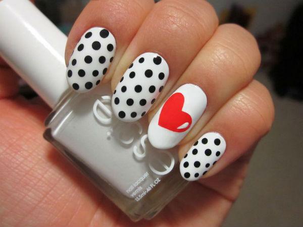 Красивое акцентное сердечко легко создать из точек различного размера и цвета. Советуем нарисовать карандашом едва заметный контур в таком маникюре, а потом его стереть. Так фигура получится идеально ровной.