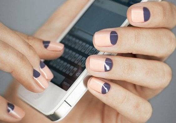 - лунный маникюр, в котором второй цвет дается у основания ногтя, а не на кончике;