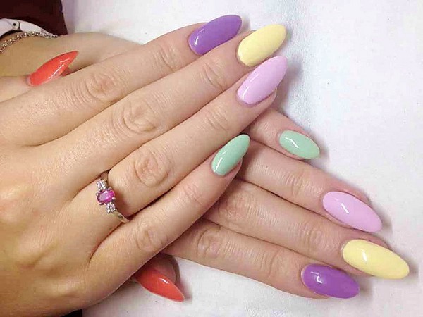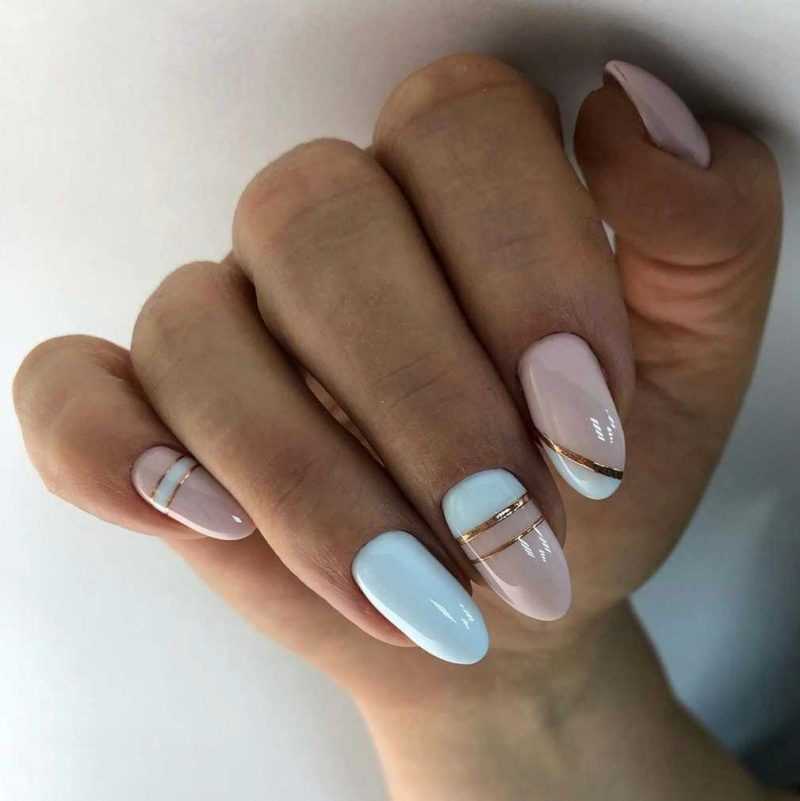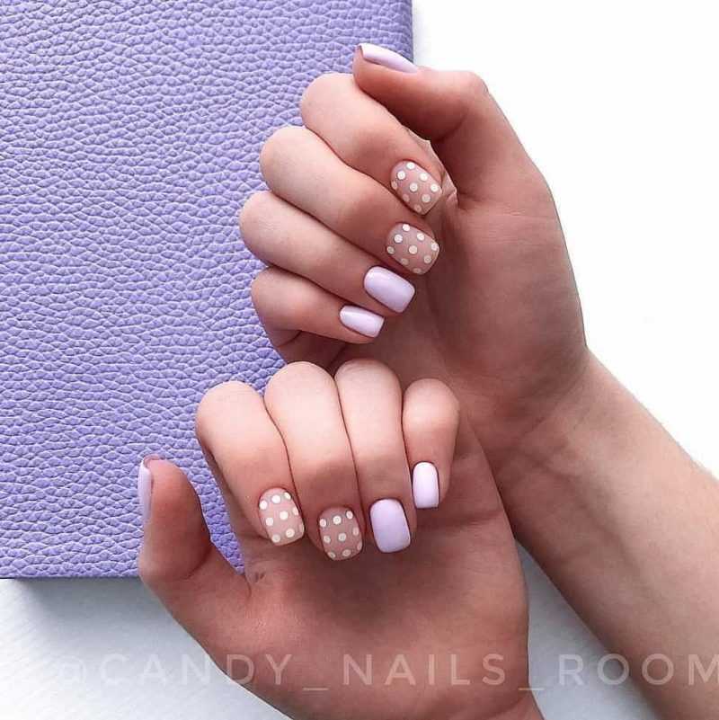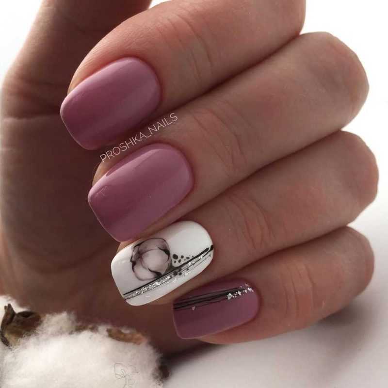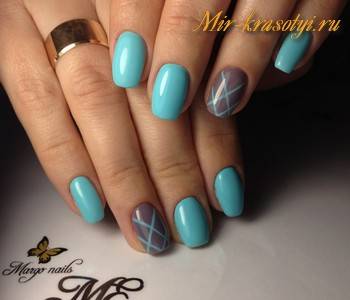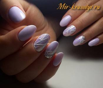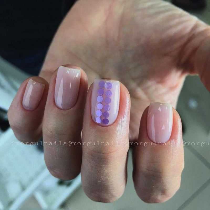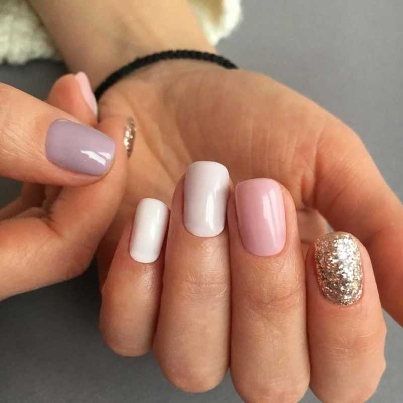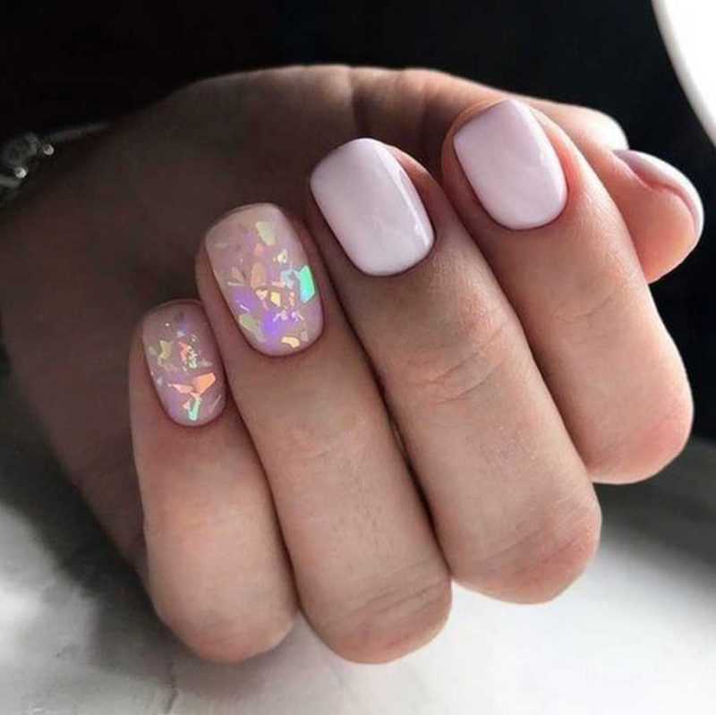 - однотонный маникюр, сделанный с помощью неярких модных цветов лака (светло-розовый, лиловый, голубой);
