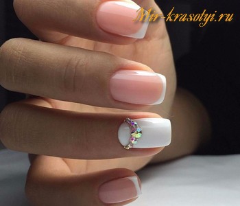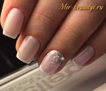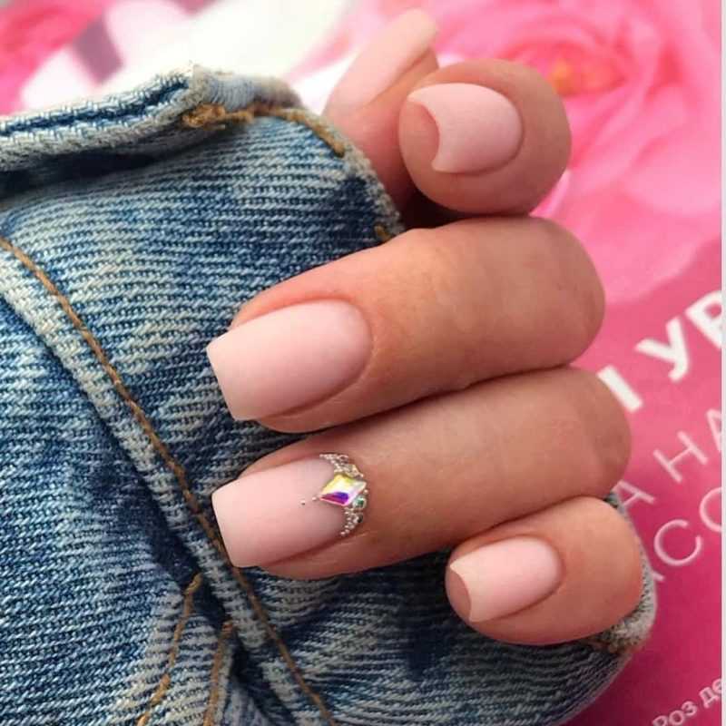 Светло-розовый праздничный маникюр с камешком.