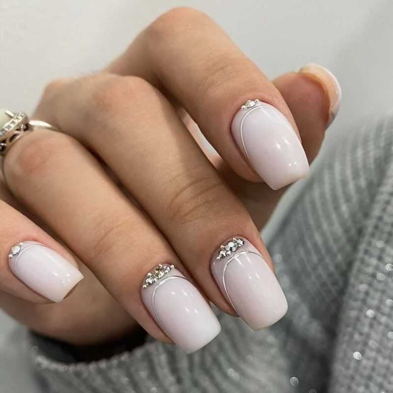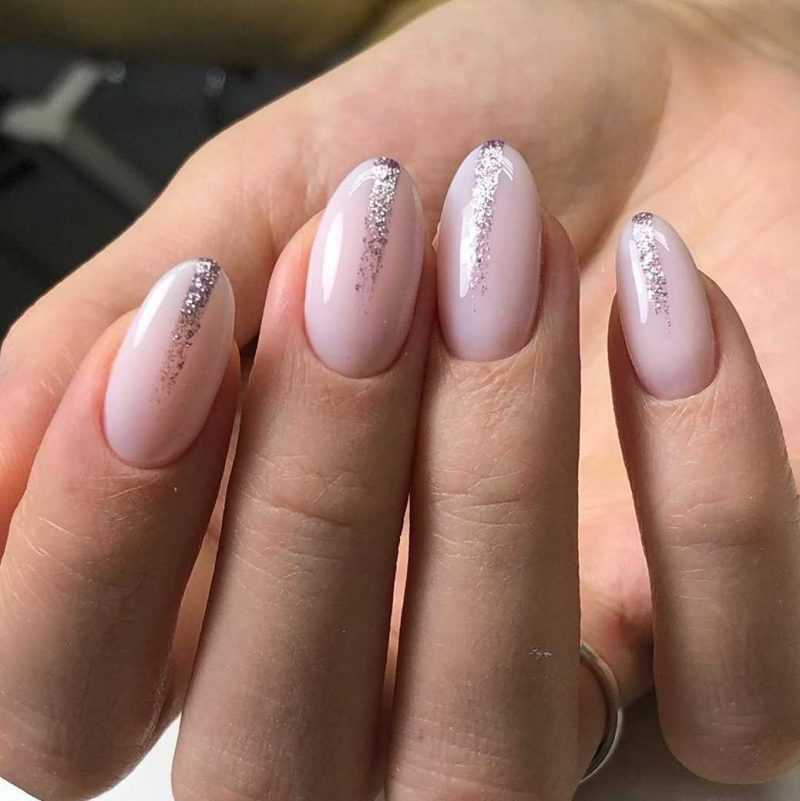 Разместите стразы около кутикулы или блестящие акценты, к примеру лунки и линии. Также замечательно выглядит растяжка из блесток, плавно сходящая на нет.
