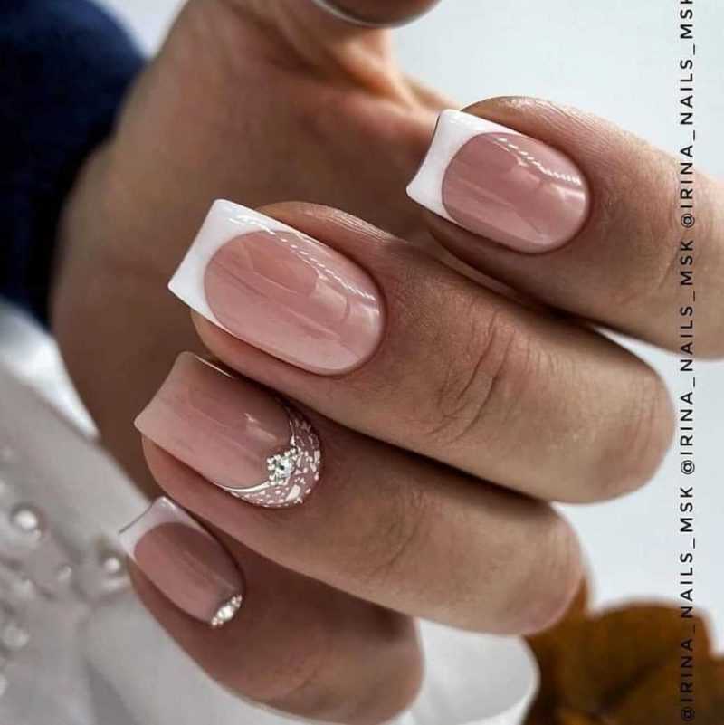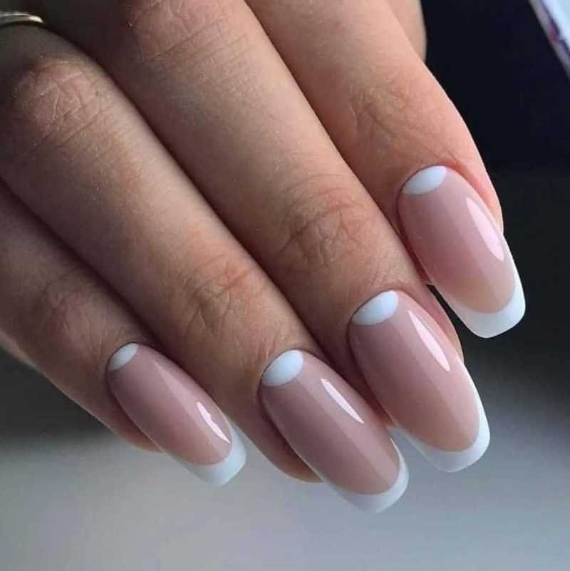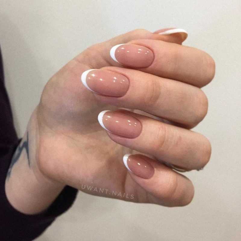 - классический французский маникюр в двух цветах — базовый «камуфляжный» (телесный) и светлый (чаще всего белый) для линии «улыбки»;