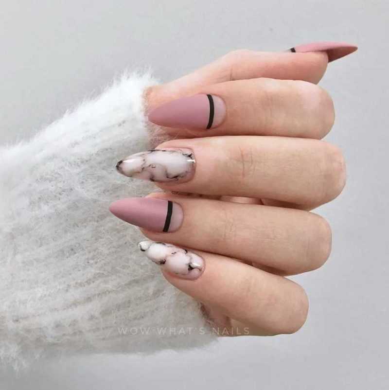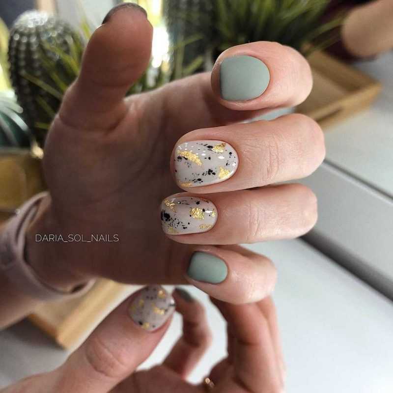А в этой работе все модные тенденции 2021-2022 собраны на одних ноготках — трендовые цвета, матовое покрытие, «мраморный» дизайн. Сочетание очень удачное.