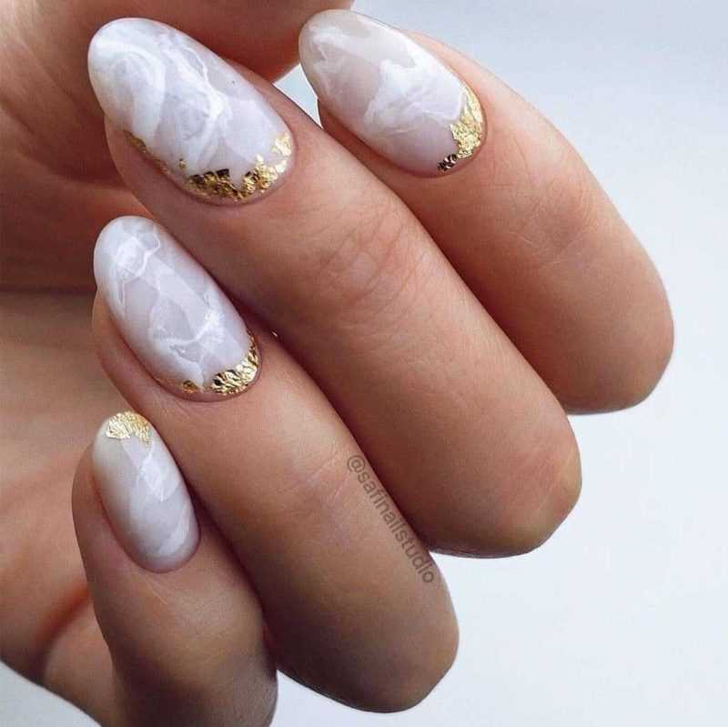 На небольшой длине очень гармонично впишется овальная форма ногтей и форма мягкий квадрат. В качестве дизайна прекрасно подойдут минималистичные рисунки, небольшое количество блесток золотого и серебряного цветов и лунный маникюр. Если имеется хотя бы пару миллиметров свободного края подумайте о французском маникюре в классическом исполнении.