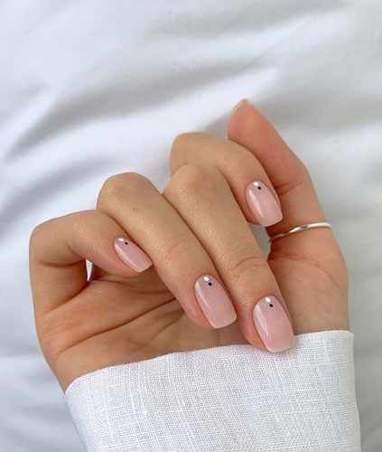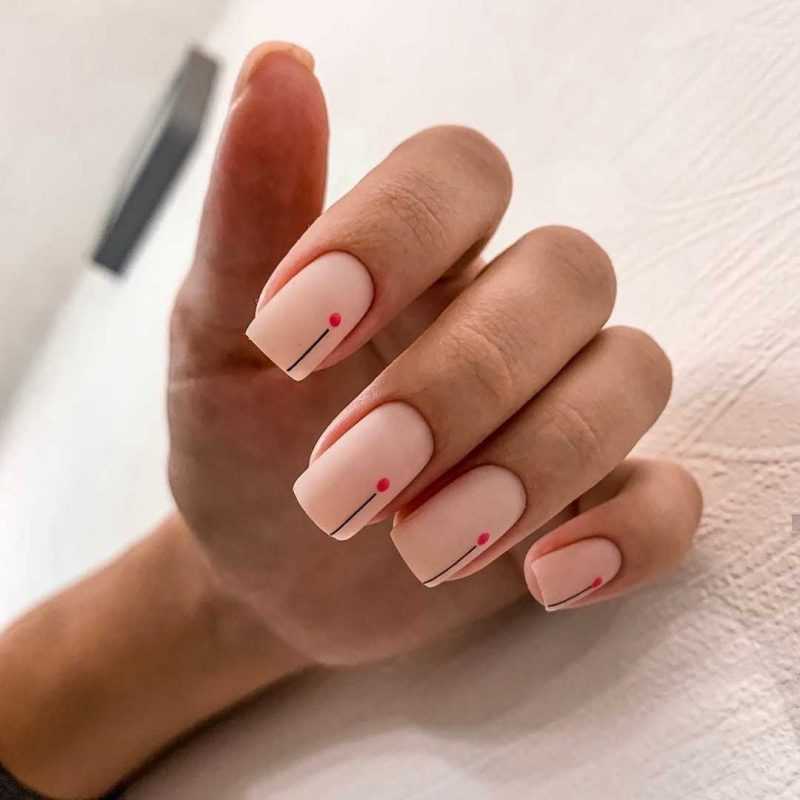 Основа — любой телесный лак из твоего бьюти-арсенала. Темным лаком ставь точки. Безупречно будет, если ты покроешь весь дизайн матовым топом (его еще называют финиш).