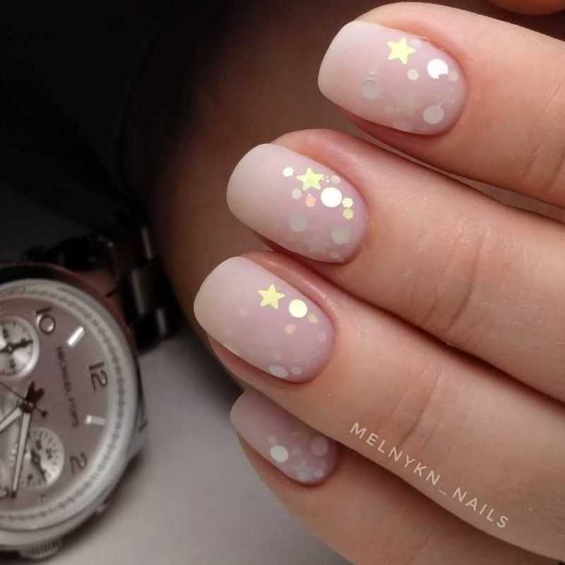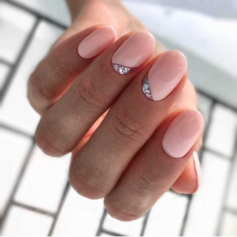 - Максимум, что можно использовать — серебристый или золотистый глиттер, но им не стоит покрывать все ноготки, а можно лишь сделать ненавязчивый акцент, покрыв им один из пальчиков.