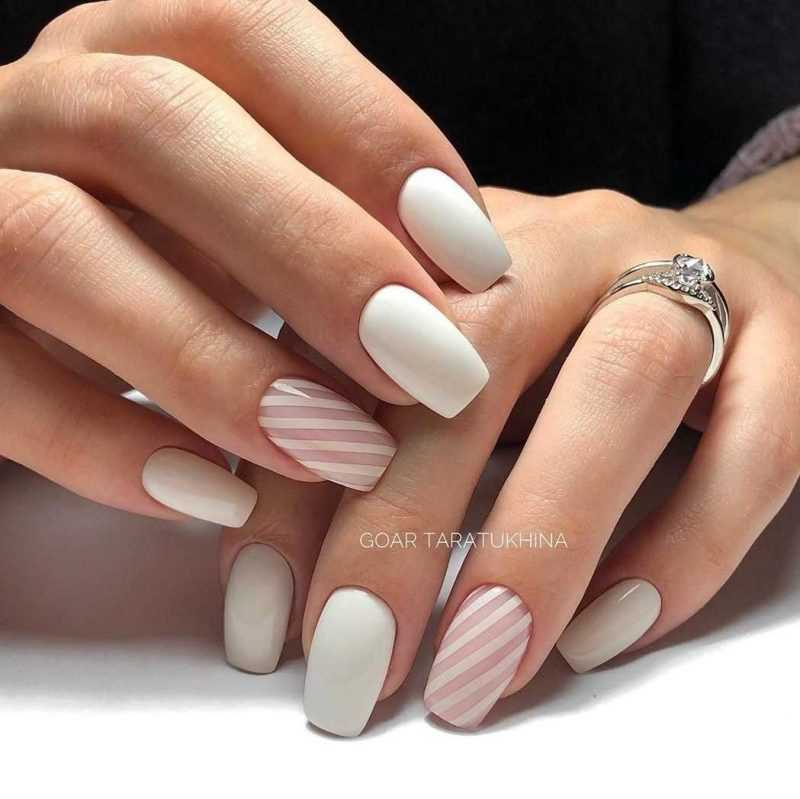 Самый простой и нехлопотный вариант сделать маникюр на 1 сентября в домашних условиях — это покрыть ногти несколькими бежевыми оттенками лака. Так будет значительно интереснее, чем однотонное покрытие одним цветом.