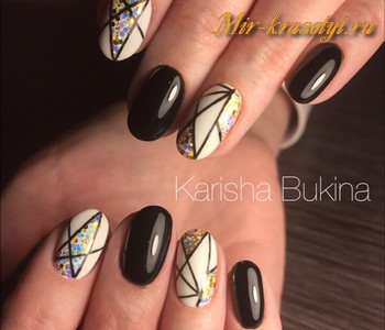 Смотрится он строго и торжественно, привлекая при этом к себе внимание. Если девушкам очень хочется сделать яркий маникюр, но при этом не использовать красные оттенки лака, чёрно-белый вариант будет подходящим решением