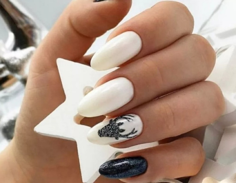 Модный зимний маникюр 2020 года – это сочетание нескольких техник одновременно: рисунок и френч. Поэтому мастер может выполнить не только интересную асимметричную улыбку. Рисунки часто продаются в виде наклеек, так что сделать оригинальный маникюр будет не сложно.
