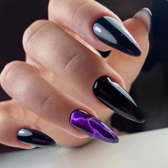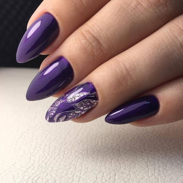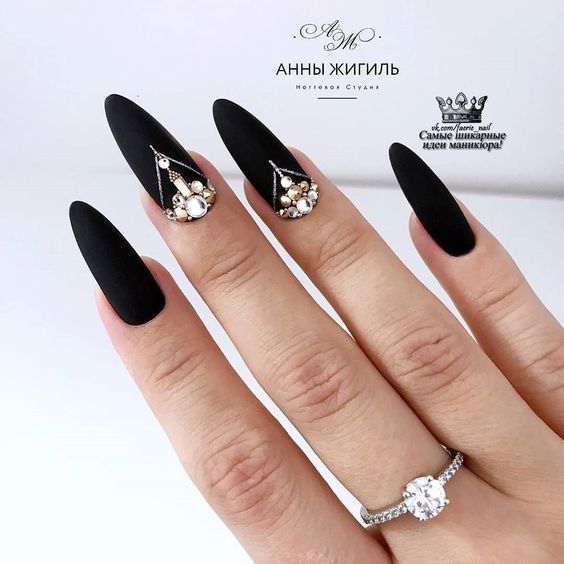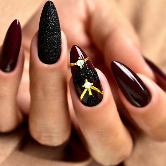 Темные тона прекрасно подчеркивают длину ногтя. Чтобы маникюр не был слишком мрачным, с таким цветом рекомендуется сочетать разные дизайнерские приемы: