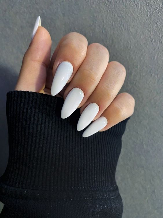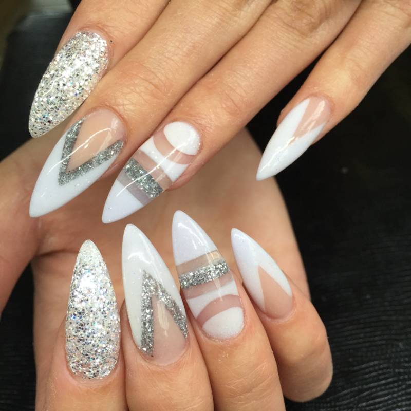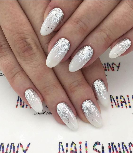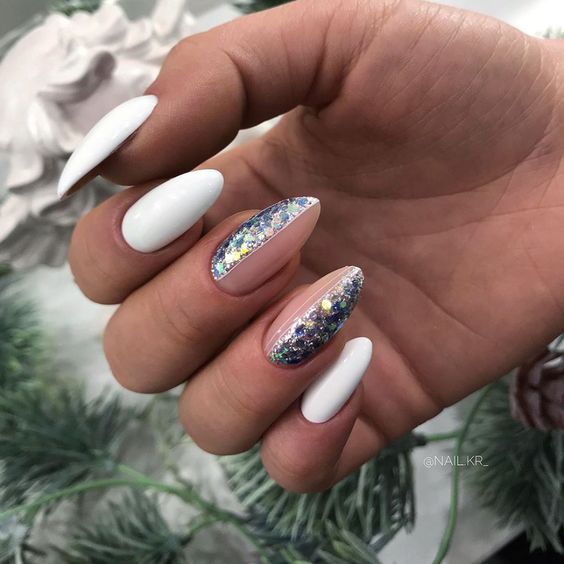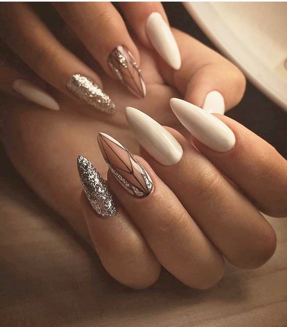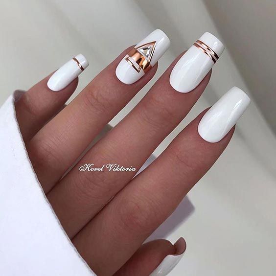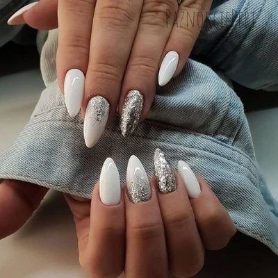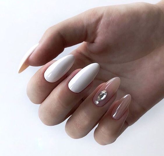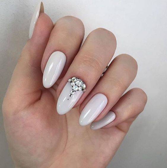 В холодное время года белый цвет становится одним из наиболее востребованных. На ноготках большой длины белый смотрится нежно, свежо, он идеален для свадьбы, романтического свидания. С белым шикарно сочетаются бусины, стразы, блёстки.