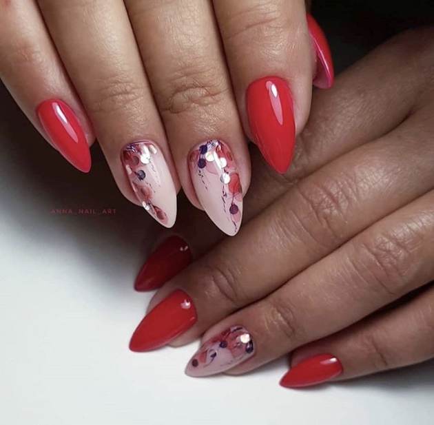 Красный маникюр может быть как в классическом однотонном варианте исполнения, так и в виде небольшого красного элемента на нюдовом или бежевом фоне. Также, очень стильно и ярко смотрится сочетание красного с белым цветом.