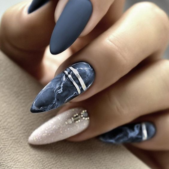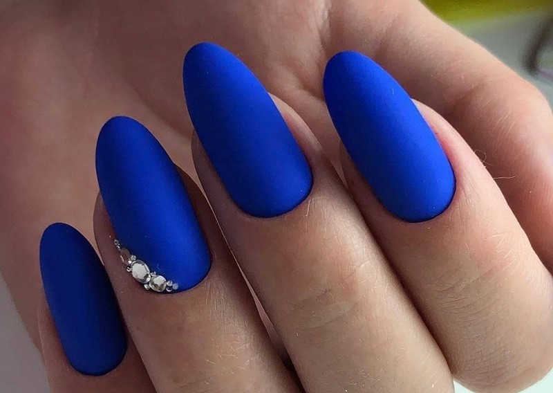 Очень красиво смотрится как классический однотонный синий маникюр, так и сочетание синего с белым цветом.