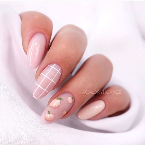 Персиковый маникюр очень красиво сочетается со стразами или нежными кружевами.