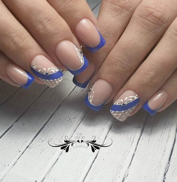 Синий френч – это еще один оригинальный подход к исполнению классического маникюра. Чтобы придать дизайну нежности, попросите мастера сделать небольшой дополнительный рисунок. А если хочется больше ярких переливов, тогда вам не обойтись без маленьких страз, которые ловят каждый лучик света и отражают его своим неимоверным блеском.