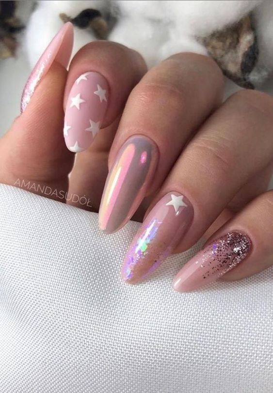 Рекомендую присмотреться и к блестящему переливающемуся маникюру. Лучшие мастера маникюра уже давно используют это в практике.