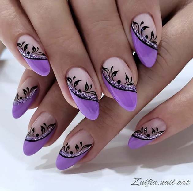 Ярко и оригинально будет смотреться фиолетовый френч. Можно его сочетать с белыми или черными элементами.
