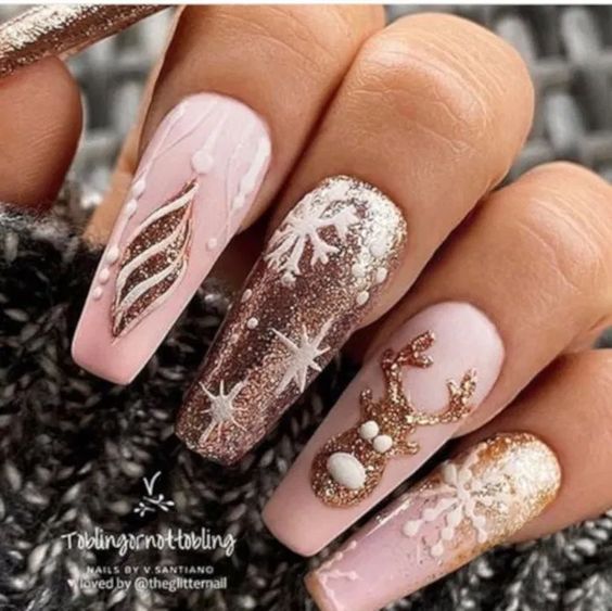 Модный зимний маникюр 2020 года – это сочетание нескольких техник одновременно: рисунок и френч. Поэтому мастер может выполнить не только интересную асимметричную улыбку. Рисунки часто продаются в виде наклеек, так что сделать оригинальный маникюр будет не сложно.