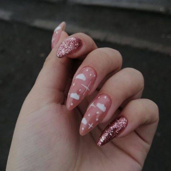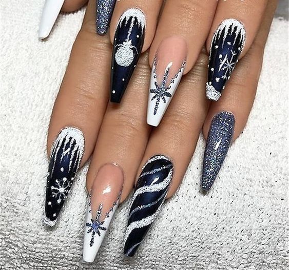 Неотъемлемый атрибут зимнего настроения – звезды, луна. В морозные ночи они видны очень хорошо. Поэтому сказочную атмосферу можно перенести и на ногти. Такой дизайн получается контрастным, ярким, насыщенным и подходит тем, кто не боится показать себя.