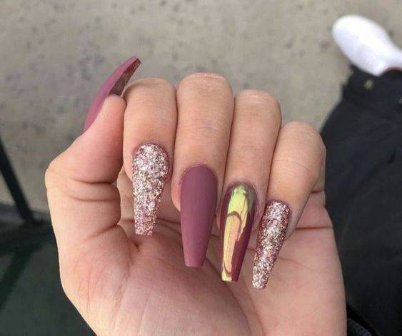 Чтобы поправлять фольгу во время нанесения, можно использовать апельсиновую палочку. Акцент можно делать как на двух ногтях, так и выложить битое стекло на все. Визуально ознакомиться с инструкцией можно в данном видео.