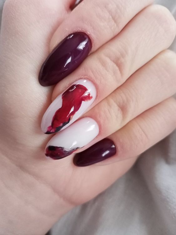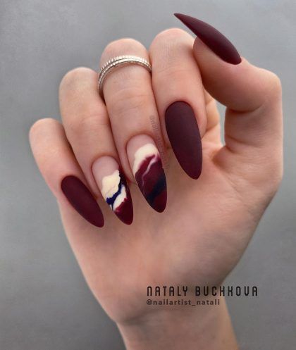 Бордовый маникюр шикарно смотрится в сочетании с белым или черным дизайном.