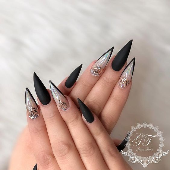 - Обработать ногти и придать им форму. Битое стекло хорошо смотрится на любой форме, однако более эффектно смотрится на острых длинных ноготках.