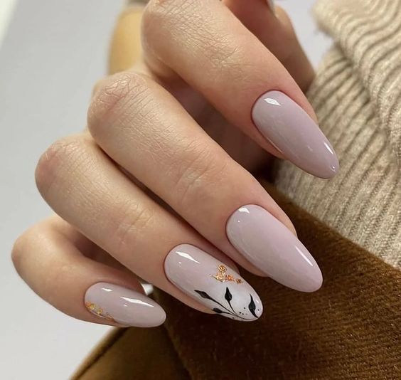 Сочетание приглушенного оттенка лака с росписью вензелями не оставит равнодушной ни одну поклонницу изящного маникюра.