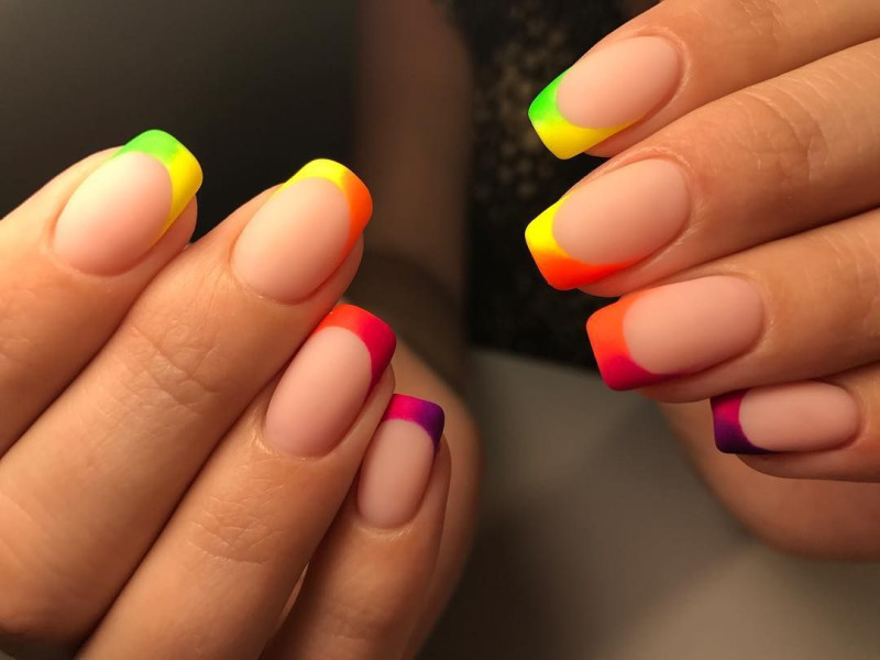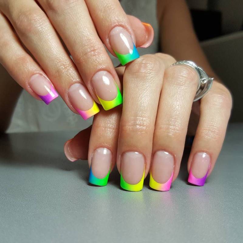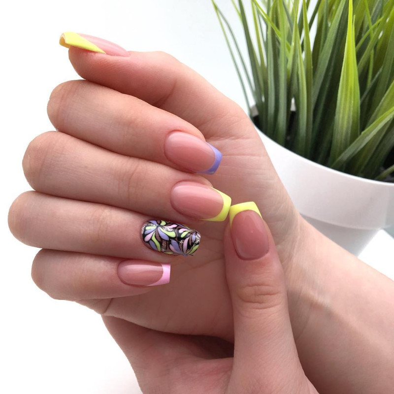 Многие жизнерадостные цвета будут прекрасно смотреться на длинном квадрате. Помимо этого благодаря ярким цветам можно придать изюминку модному по сей день французскому маникюру. В этом случае за основу берется нейтральный оттенок как основа, а ярким тоном покрывается кончик ногтевой пластины.