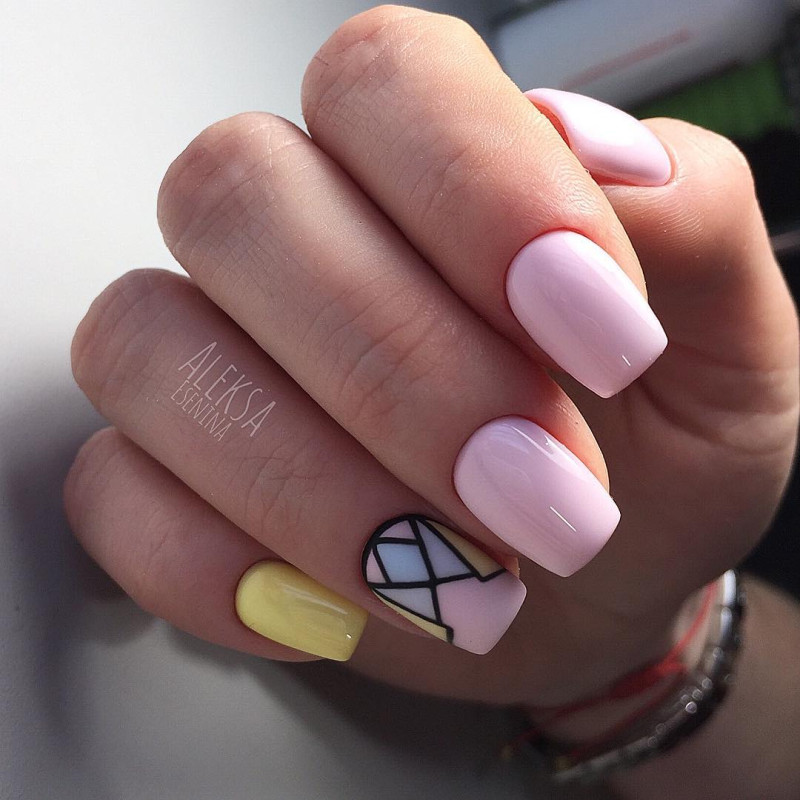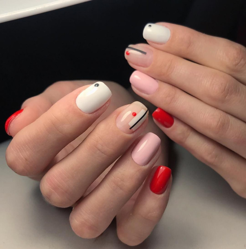 И, пожалуй, отдельно нужно сказать про такую разновидность абстракции как геометрический дизайн ногтей. Он состоит из точек, линий, полосок, овалов, треугольников и прочих фигур. И, безусловно, квадратная форма ногтевых пластин отлично рифмуется с ними.