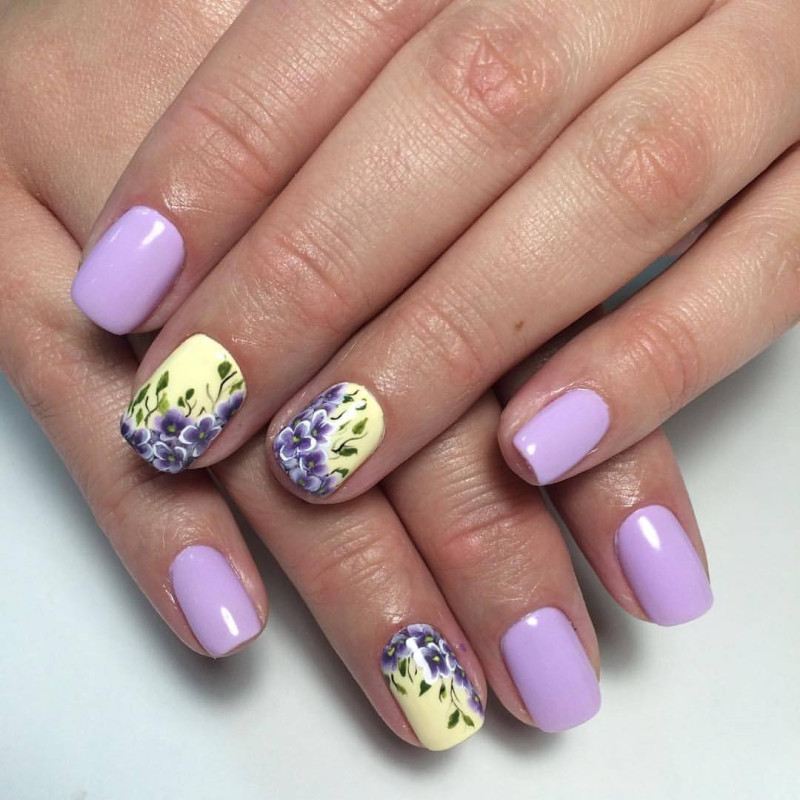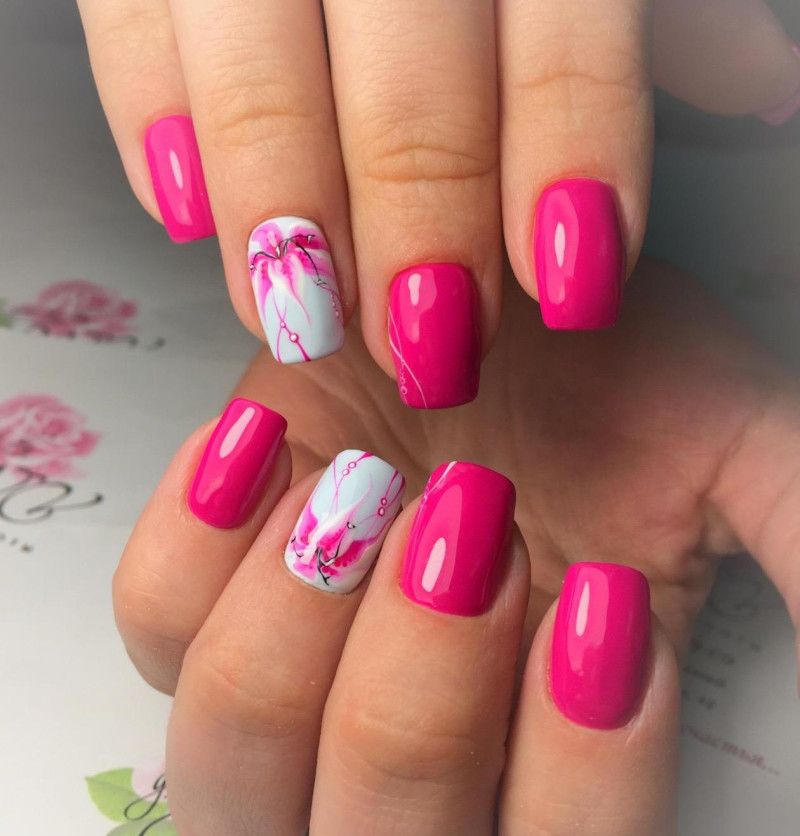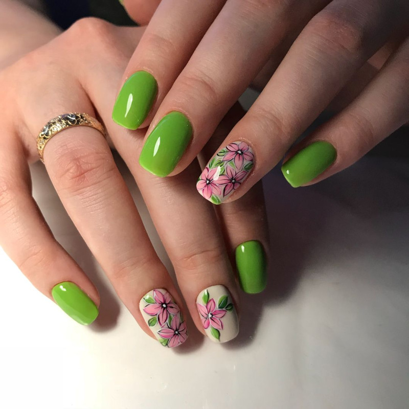Цветочные мотивы создают изысканный, романтичный образ. Но поскольку этот дизайн довольно яркий, то его лучше использовать для одного-двух пальцев.