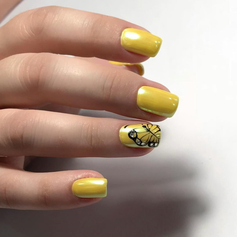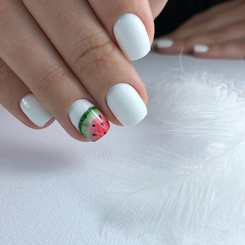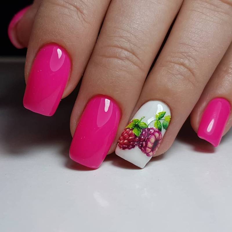 Это могут быть фрукты или тематические летние зарисовки. С блестками или небольшим количеством страз такой маникюр смотрится максимально выигрышно.