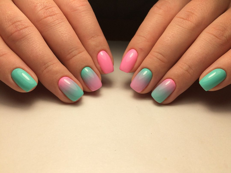 Ещё одна особенность градиента заключается в том, что границы между цветами здесь как бы размываются — в результате возникает ощущение, что оттенки буквально растворяются друг в друге. Наиболее распространённый вариант градиента в нейл-дизайне предполагает сочетание двух или трёх цветов.
