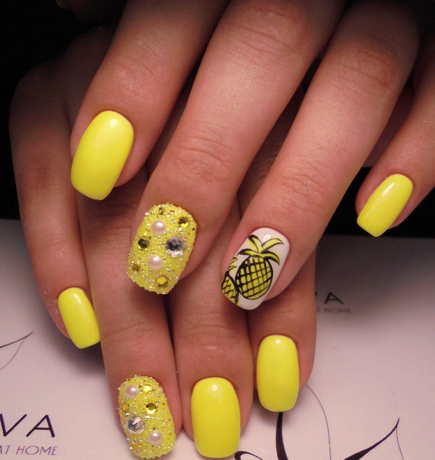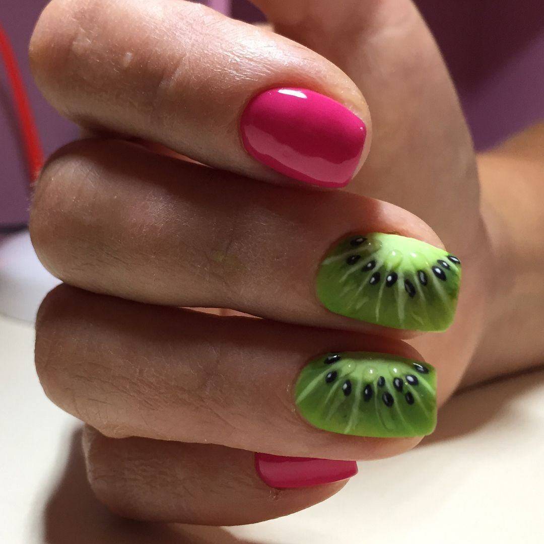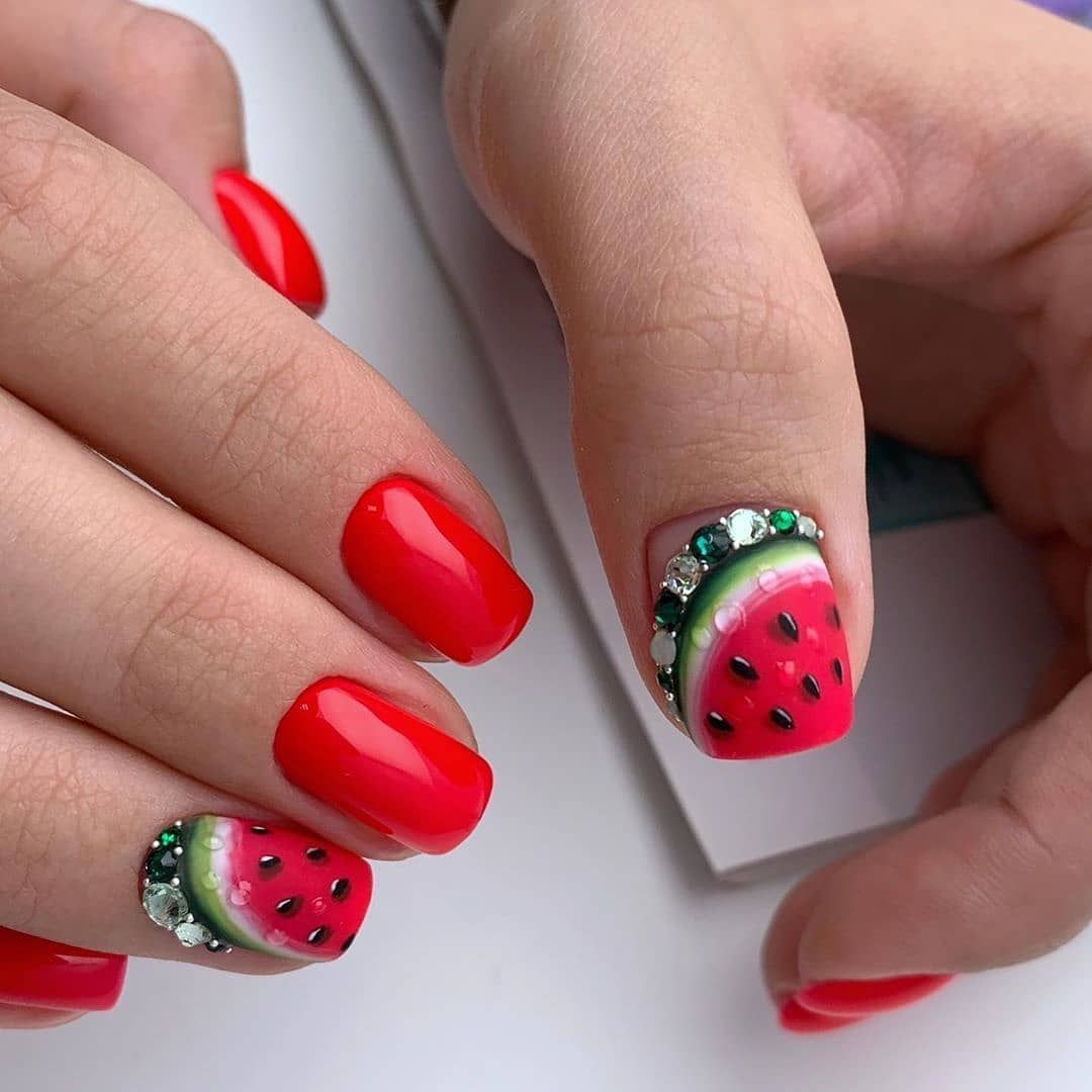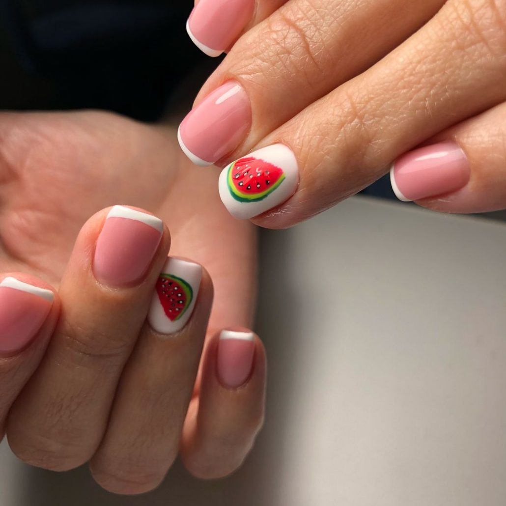 Это могут быть фрукты или тематические летние зарисовки. С блестками или небольшим количеством страз такой маникюр смотрится максимально выигрышно.