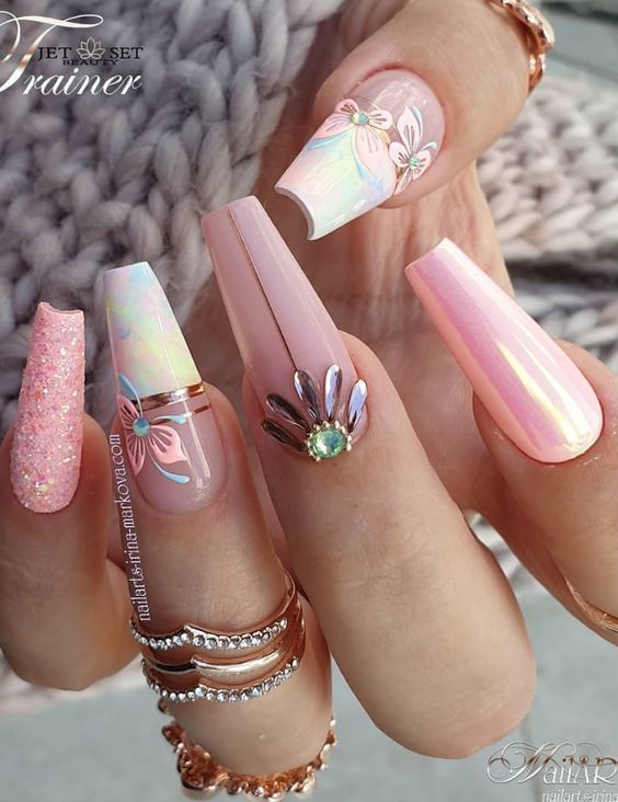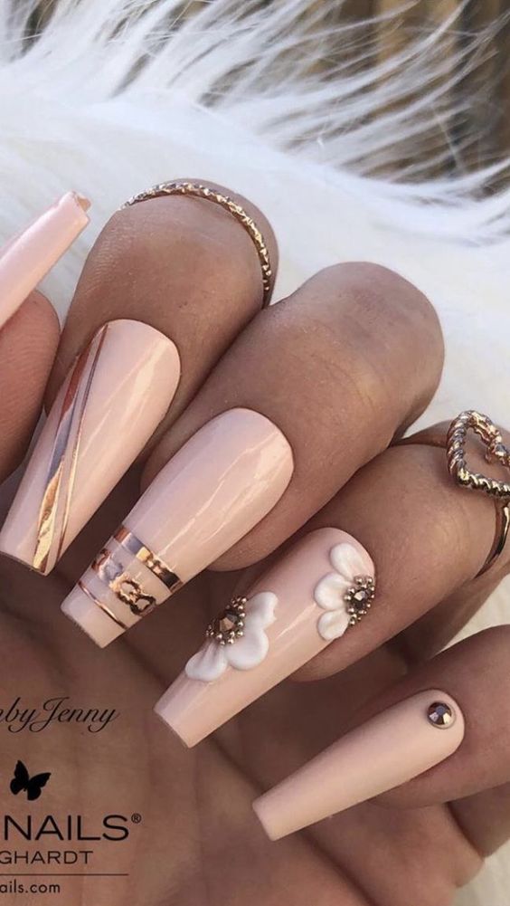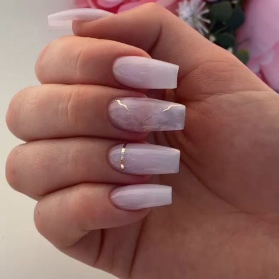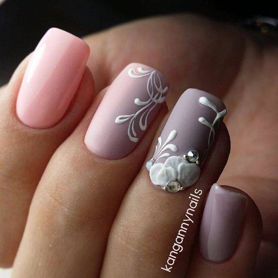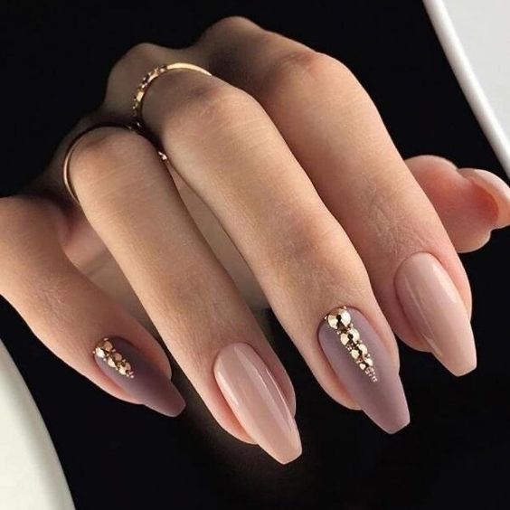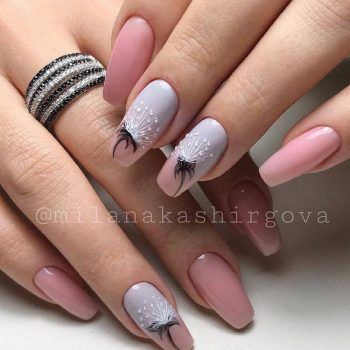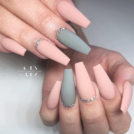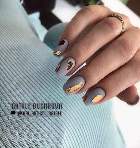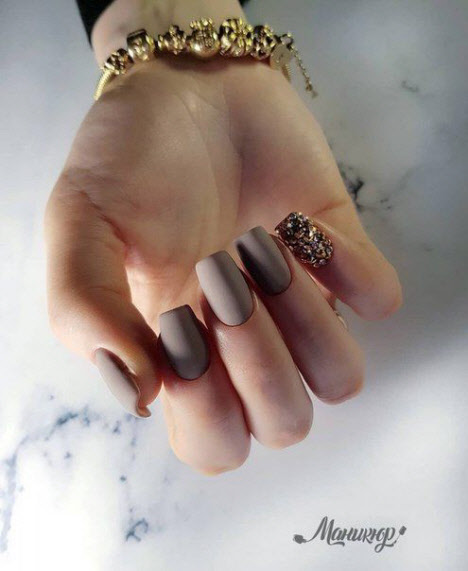 Другим фаворитом в нежном маникюре на длинные квадратные ногти будут матовые тона. Они очень популярны среди женщин всех возрастов. Ведь такие оттенки не слишком броские, они не кричащие. Данные тона придают вашим пальчикам изящности, нежности, естественности и легкости. Здесь прекрасным дополнением станут различные украшения – фольга золотого оттенка, глиттер, рисунки, комбинированный дизайн и многое другое.