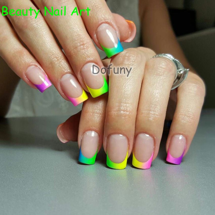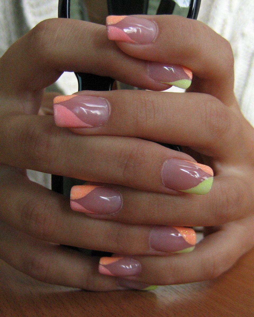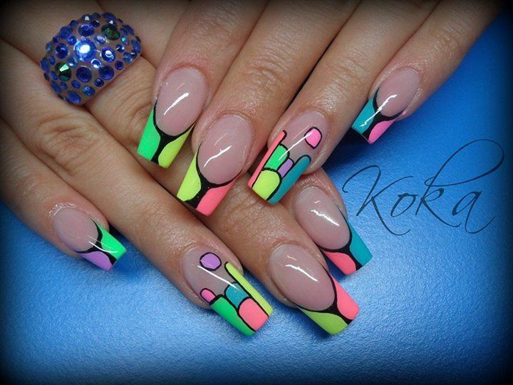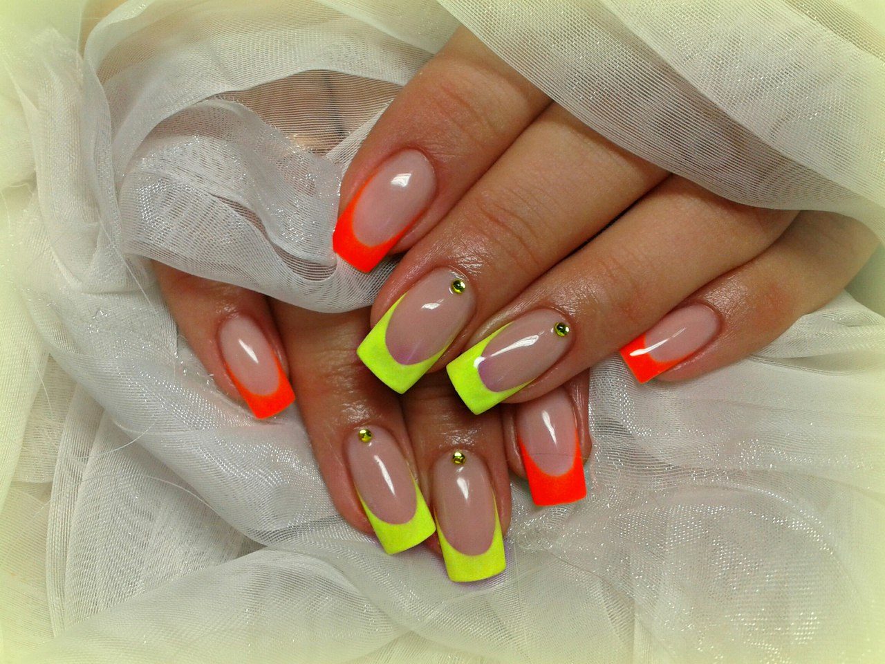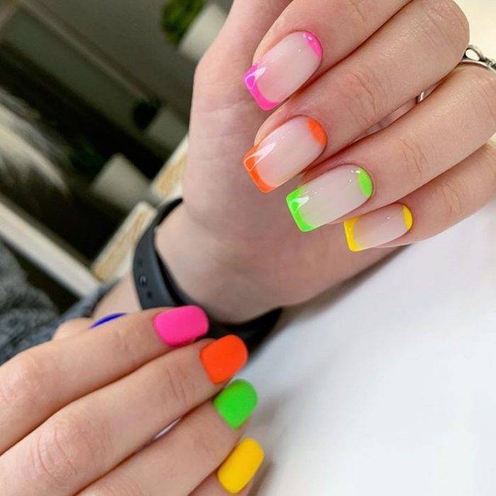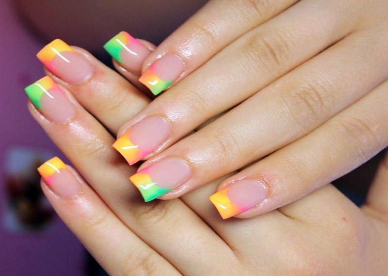 Многие жизнерадостные цвета будут прекрасно смотреться на длинном квадрате. Помимо этого благодаря ярким цветам можно придать изюминку модному по сей день французскому маникюру. В этом случае за основу берется нейтральный оттенок как основа, а ярким тоном покрывается кончик ногтевой пластины.