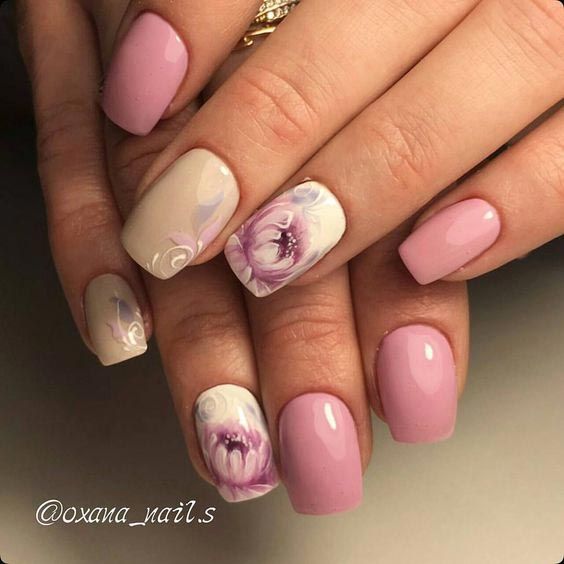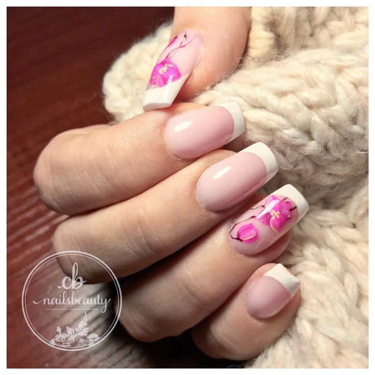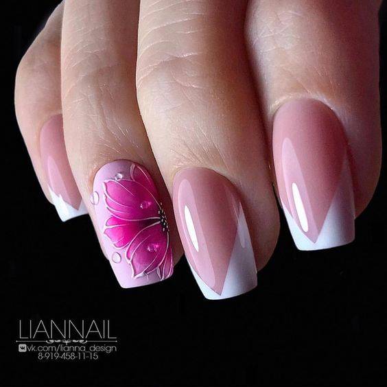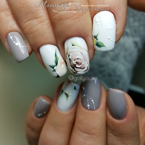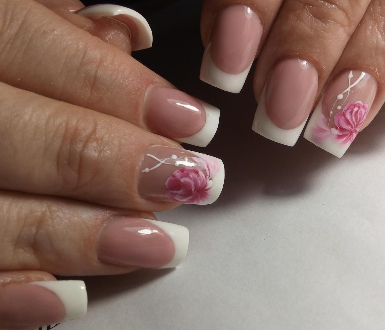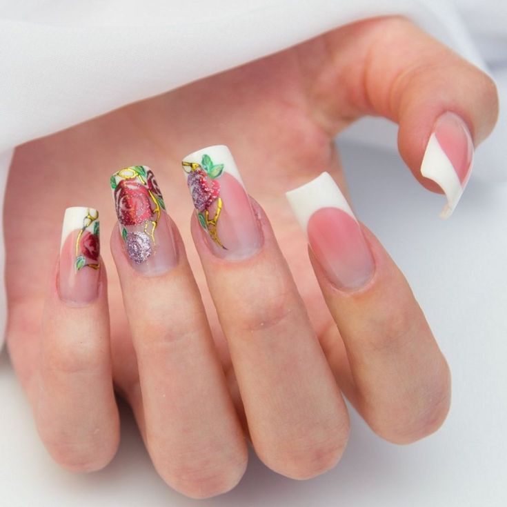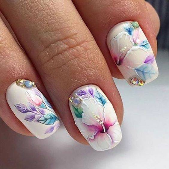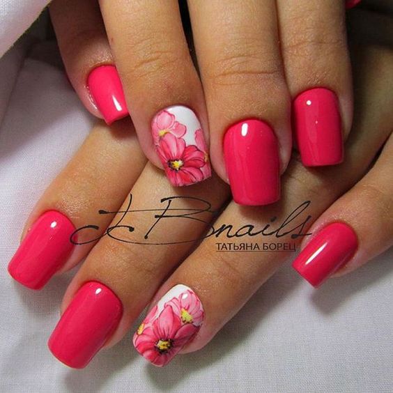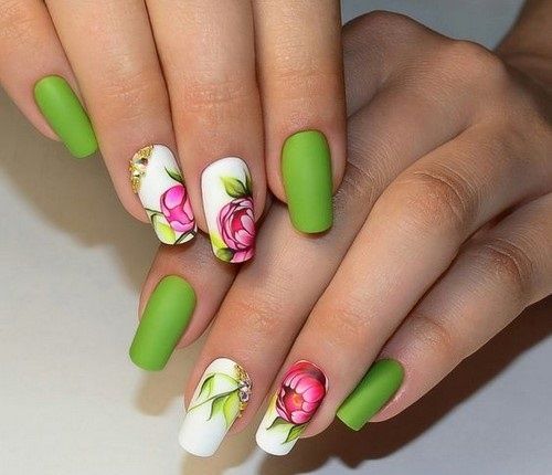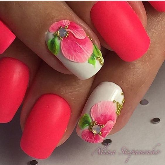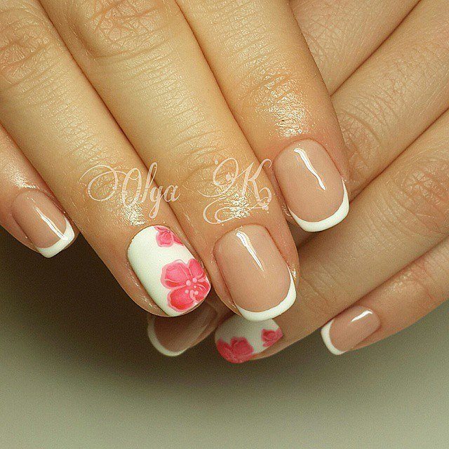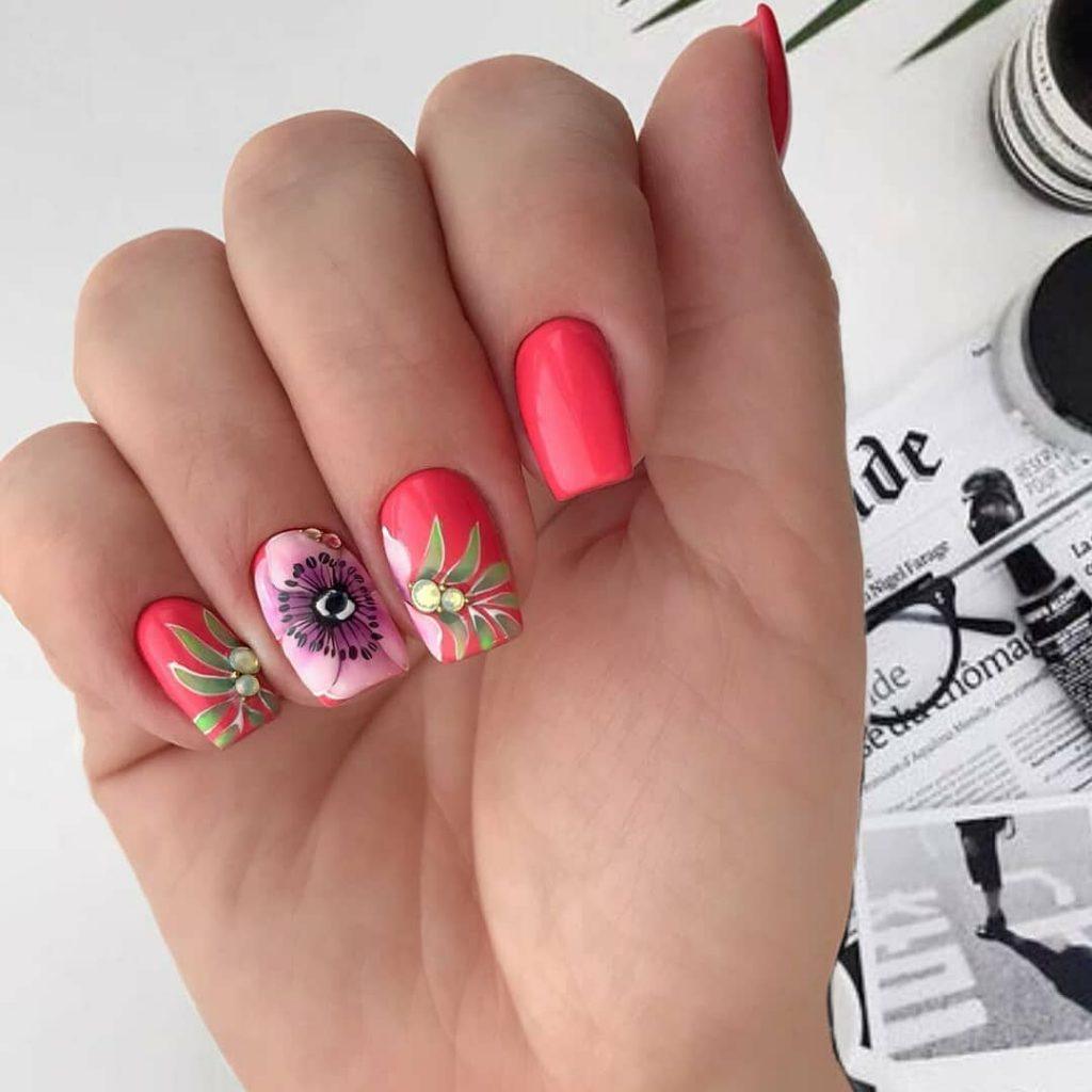 Цветочные мотивы создают изысканный, романтичный образ. Но поскольку этот дизайн довольно яркий, то его лучше использовать для одного-двух пальцев.