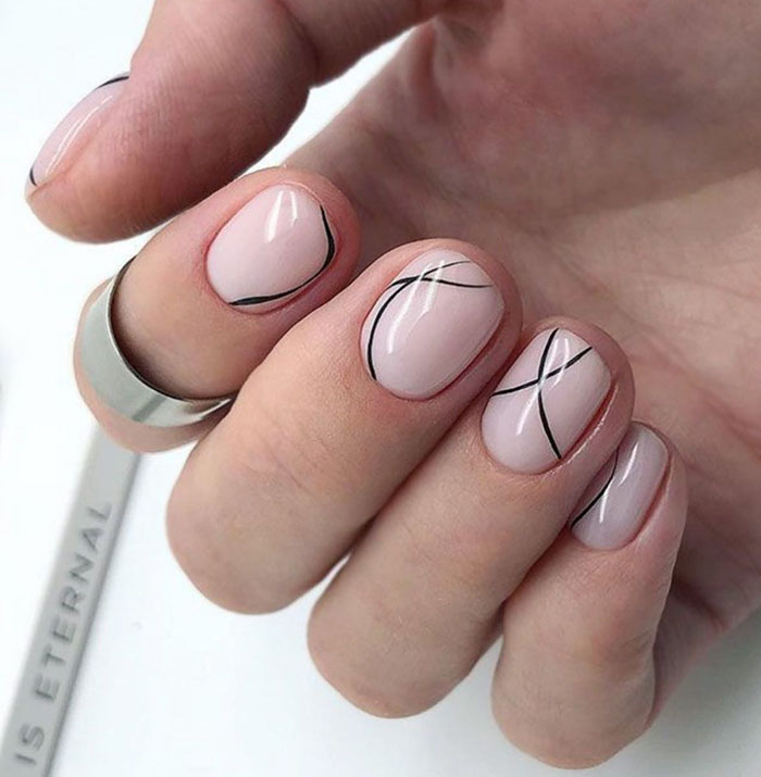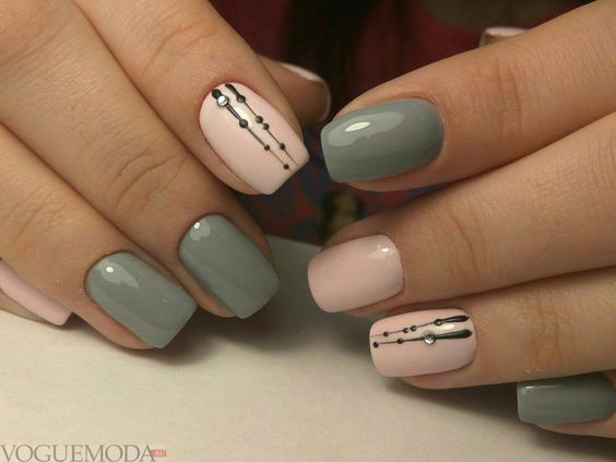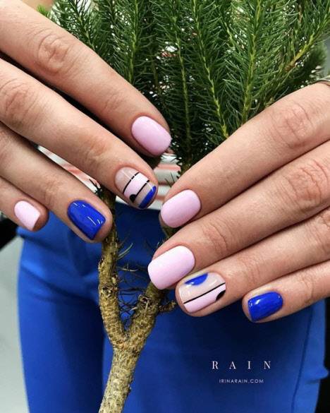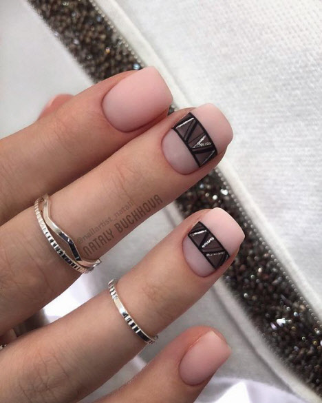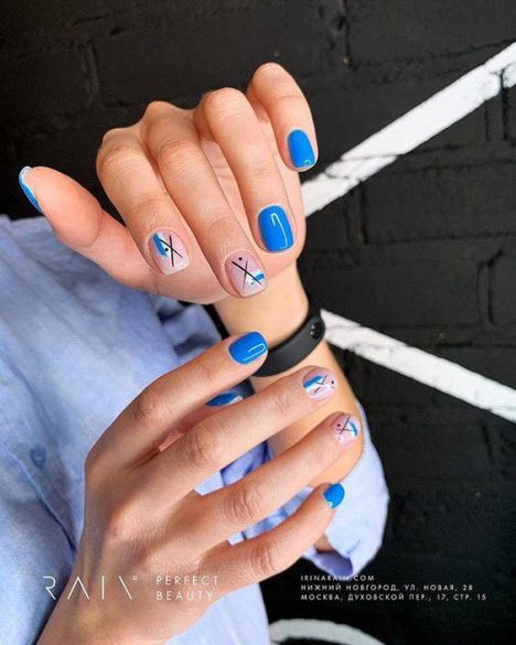 В тренде сегодня (и останется в ближайшем будущем) геометрия. Это значит, что вы можете использовать лаки светлых или относительно темных спокойных оттенков и выполнять узор поверх тонкими четкими линиями контрастного цвета.