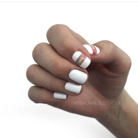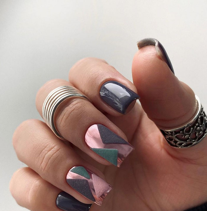 И, пожалуй, отдельно нужно сказать про такую разновидность абстракции как геометрический дизайн ногтей. Он состоит из точек, линий, полосок, овалов, треугольников и прочих фигур. И, безусловно, квадратная форма ногтевых пластин отлично рифмуется с ними.