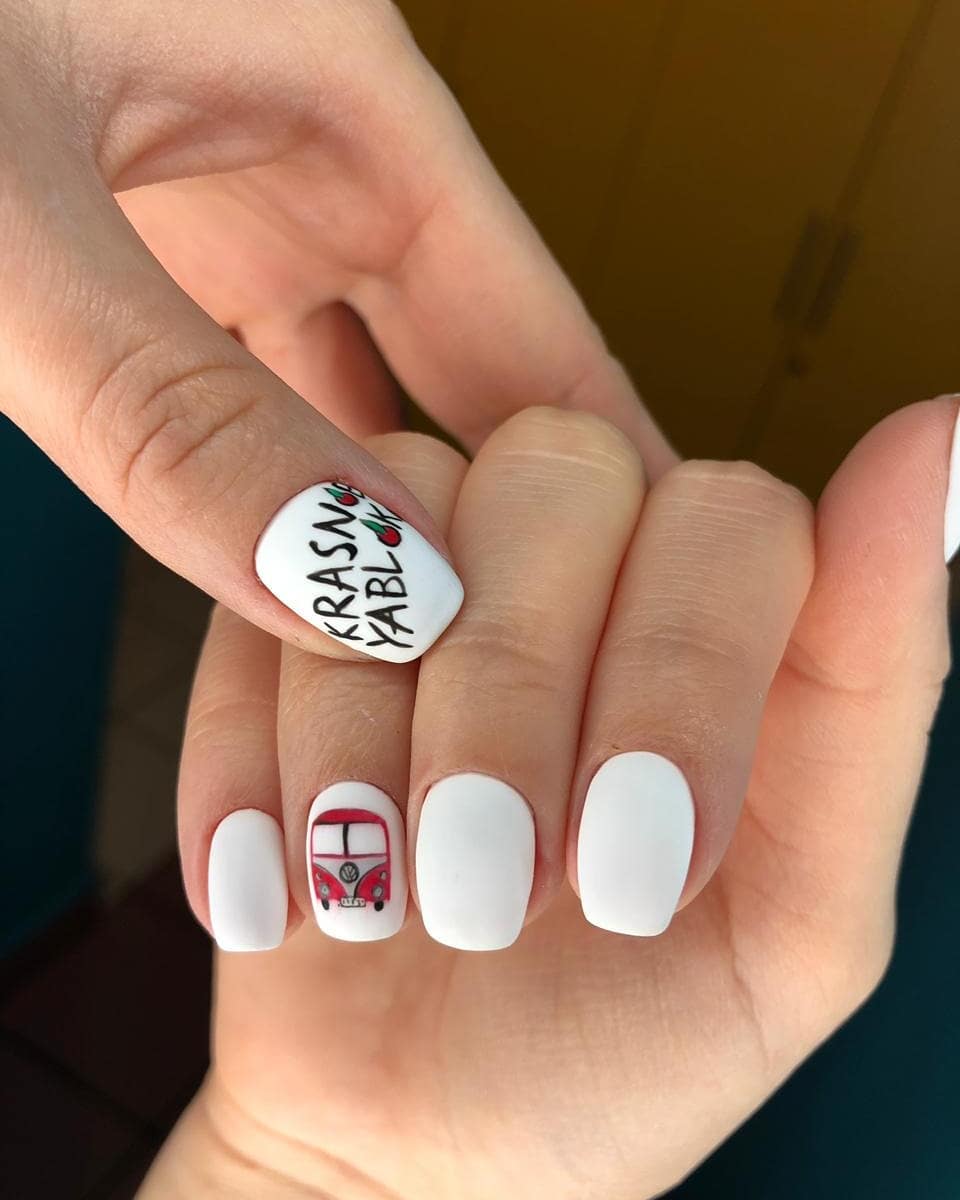 Слоганы, надписи и цитаты все чаще используются для дизайна ногтей независимо от длины и формы. Безусловно, строгость и лаконичность маникюру придают четкие квадратные линии. Но все же многое зависит от характера и стиля оформления. Игривая фраза на светлом фоне — отличное решение, чтобы поднять настроение даже в самый хмурый день