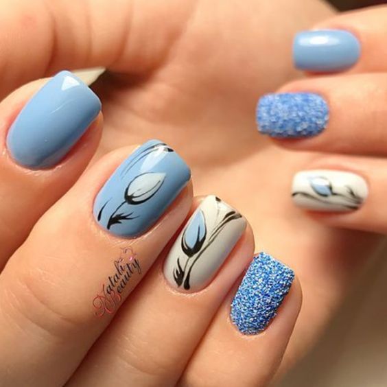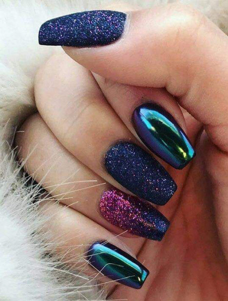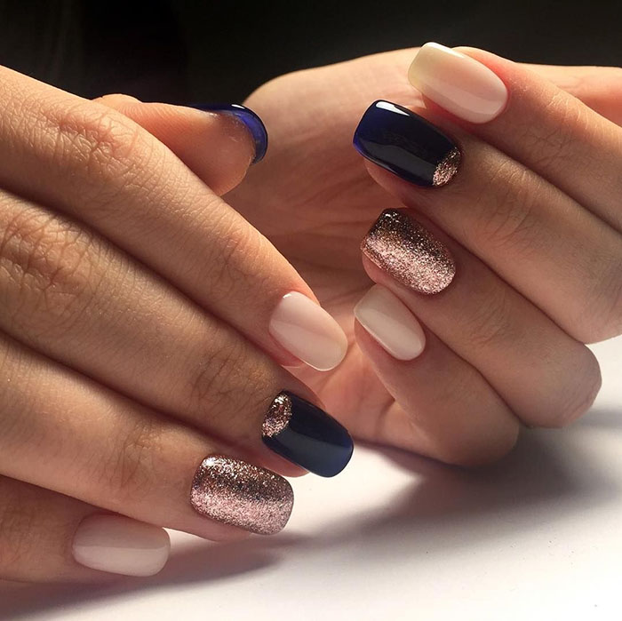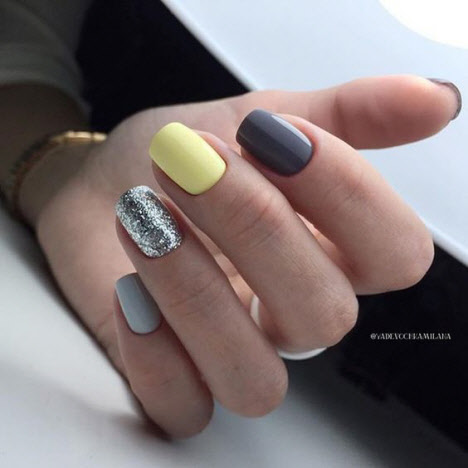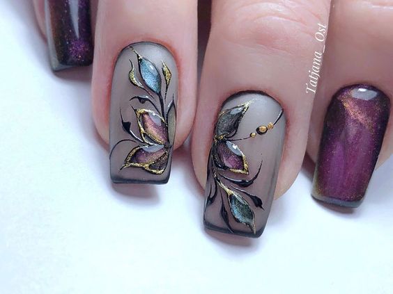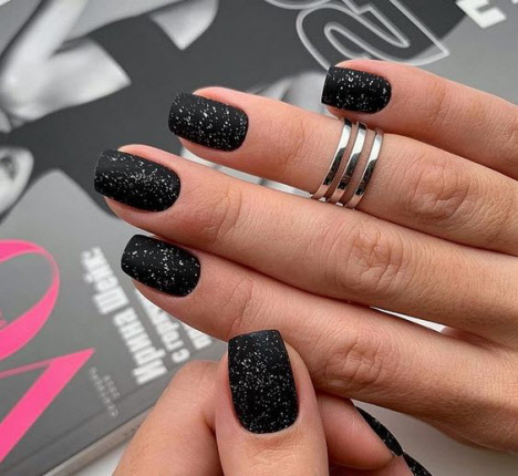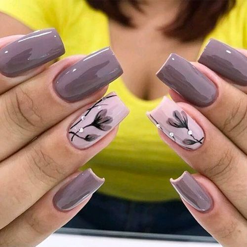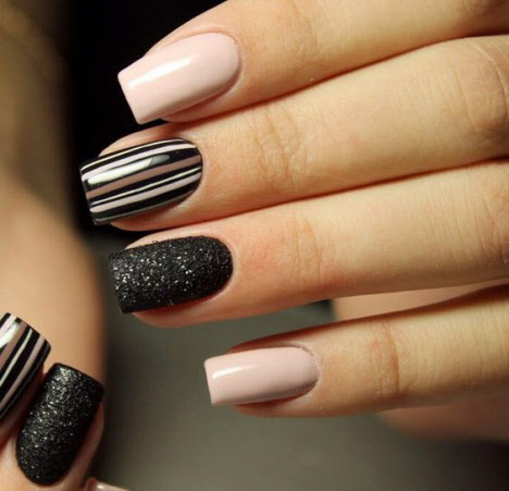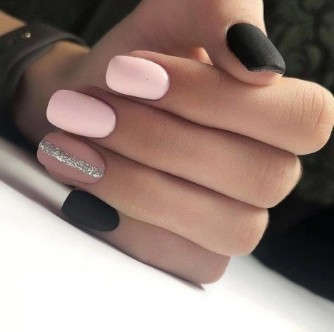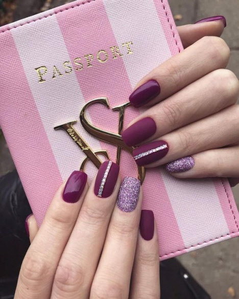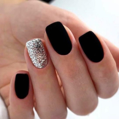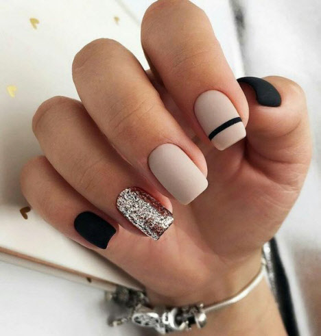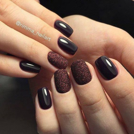 Комбинирование цветов и фактур лака придаст еще больше эффектности маникюру на квадратную форму ногтей. Например, комбинация темных оттенков лаков и блесток никогда не выходит из моды. А также сочетание матовых текстур с глянцевыми. Матовый маникюр шикарно смотрится в палитре глубоких темных оттенков, его можно комбинировать с разными вариациями рисунка и дизайна, сочетая между собой несколько оттенков лака.