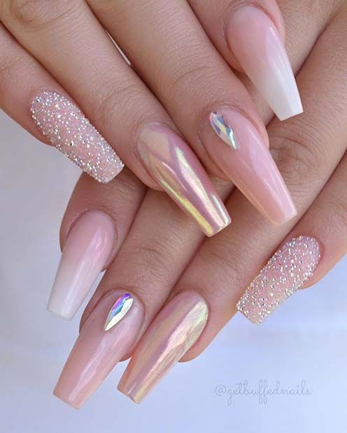 На длинных квадратных ноготках идеально будет смотреться использование жемчужной, зеркальной или другой втирки. Такое исполнение придаст вашему образу нежности, стильности, красоты. Здесь чаще всего используются светлые оттенки со сплошной втиркой. Использование страз, блесток или другого декора здесь будет неуместным. Это только усложнит внешний вид маникюра, отяготит его.
