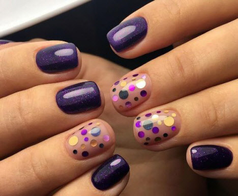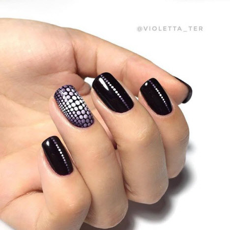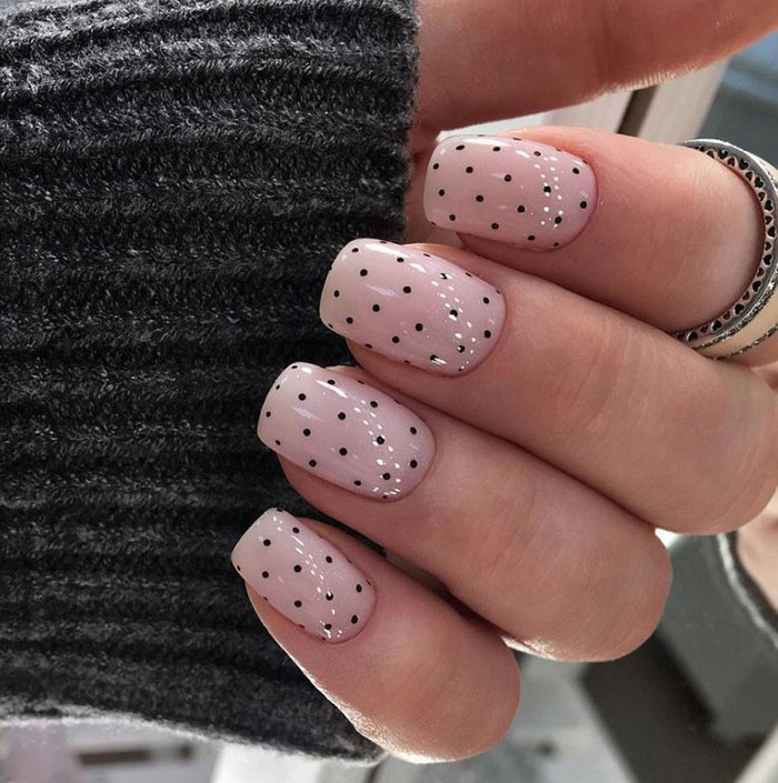 Трендом сегодня стал следующий дизайн – изображение небольших точек на ногтевой пластине, который чем-то похож на рисунок на перепелином яйце. Он чем-то схож с дизайном «брызги красок», только в этом случае вид более спокоен, аккуратен и элегантен. Помимо этого такой маникюр может дополняться различными надписями, рисунками, что будет прекрасно смотреться на квадратных ноготках.