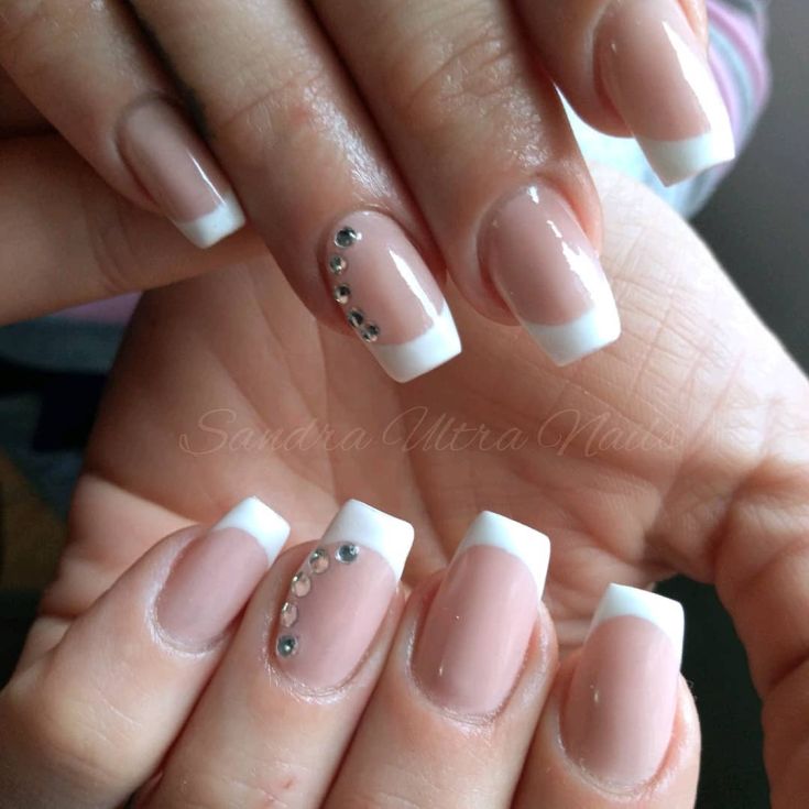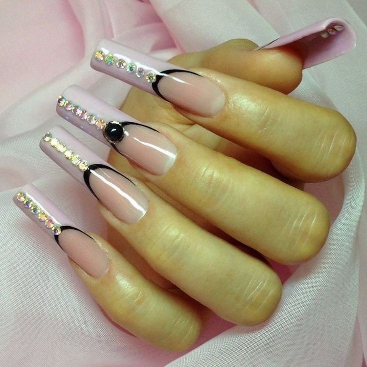 Накладные ногти довольно прочные и на них позволительны любые эксперименты. Если вы выберете стразы, то можете смело их располагать на кончиках – искусственный материал выдержит их нагрузку, а необычная форма скошенного «квадрата» в сочетании с подобным декором будет смотреться весьма ярко.