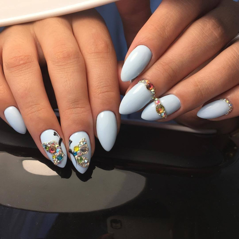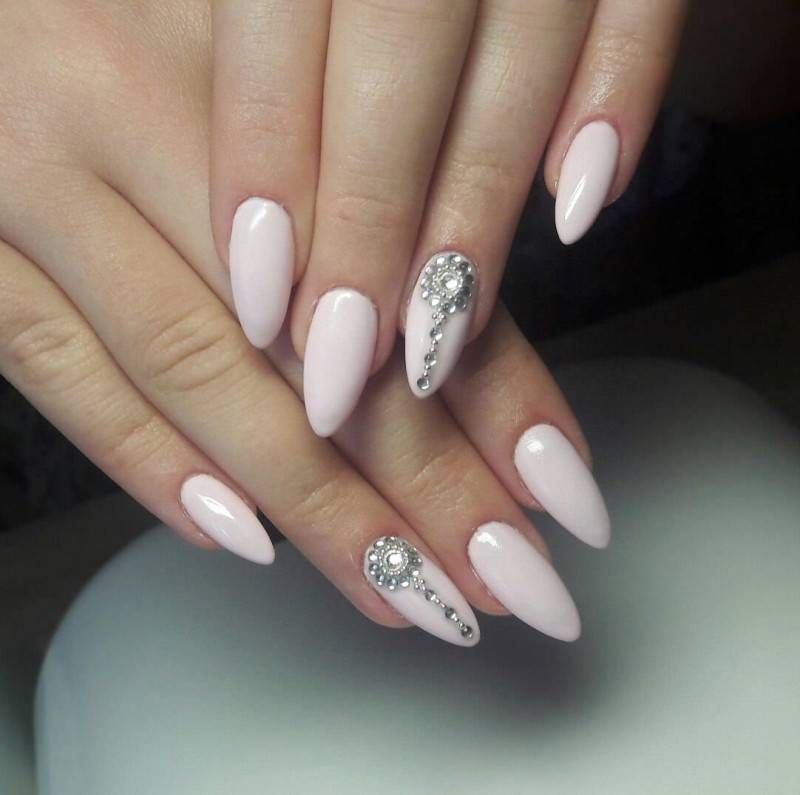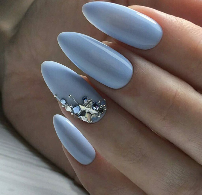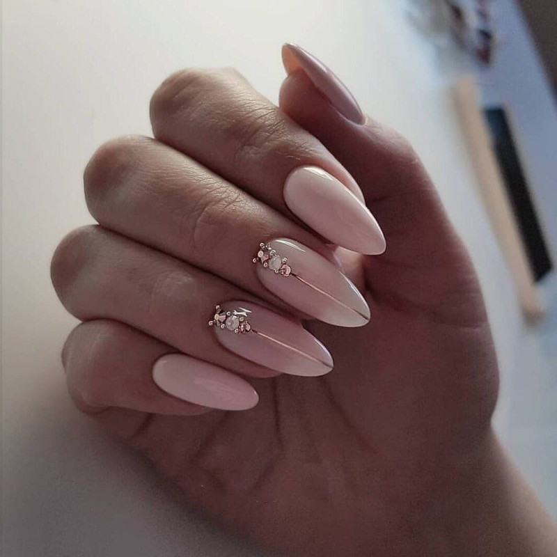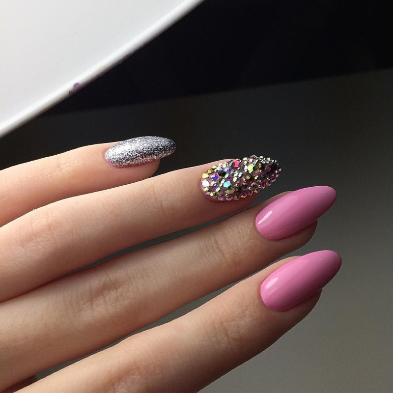 Миндальная форма ногтей – едва ли не лучший выбор в 2020 году. Она смотрится естественно и элегантно. А наличии рисунка на однотонном покрытии лишь украшает и без того прекрасный маникюр. Россыпь страз и блесток – идеальный вариант декора, с помощью которого всегда можно добавить яркости любому оформлению.